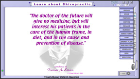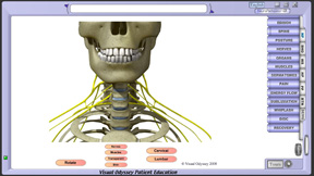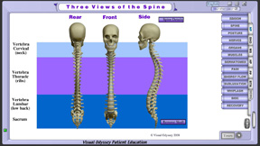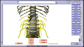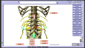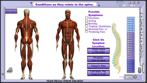 When you activate the ‘survey’ button, it takes you to a section which guides the patient through the process of choosing a symptom type and chooosing a body location and then it reveals to them the areas of the spine that oculd be responsible for that condition. This is a great screen to use during spinal screenings and consultations. |