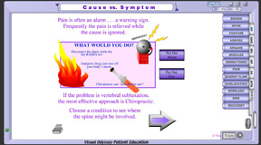 The “Cause vs. Symptom” screen uses the analogy of a fire alarm and an actual fire, the fire being the cause and the alarm being the symptom. The patient is encouraged to either put out the fire or the alarm. Selecting to “put out the alarm”, obviously doesn’t make any sense and yet that is what people are doing all the time when they are taking drugs to deal with pains and symptoms. So when we click the “back” button and click “put out fire” we’re helping them understand that that really is a more reasonable approach to the problem, but what they choose to do is really up to them. Now that you have presented all this information certainly your hope is that they will be ‘cause-oriented’ and utilize Chiropractic rather than strictly symptomatic approaches and the degenerative process that leads to. |