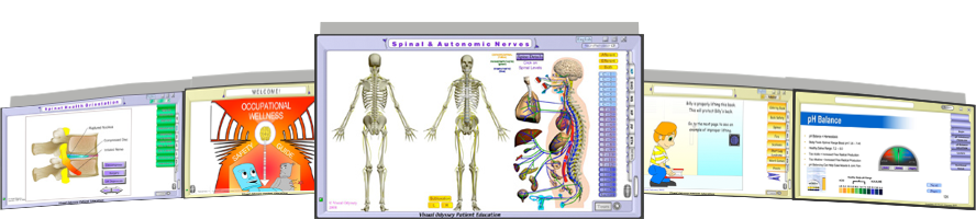 | And you can rest easily because we're not newcomers to patient education software either. Since first showing our NeuroPatholator software at Parker in January of 2001, we've delivered over 6,000 programs. With a full time artist / programmer on staff for the last 10 years, we are constantly improving and tweaking our offerings to make sure your needs are met when educating your patient. Intent on building rapport with their patients, DCs use the Visual Odyssey software in ROFs, hallways, reception rooms, adjusting rooms, at lectures and screenings. | ||||||||||||||||||||
